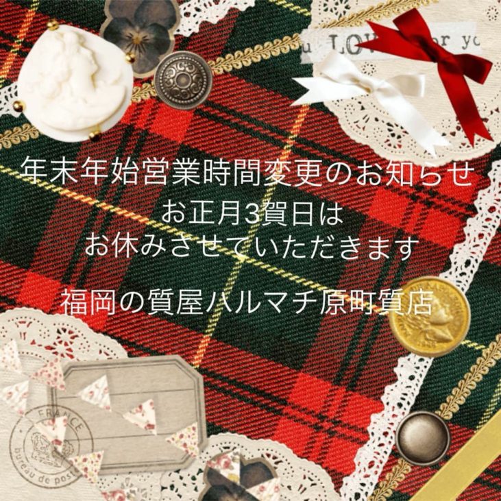 年末年始営業時間のお知らせ(お正月3賀日はお休み)福岡の質屋ハルマチ原町質店 ニュース 本日のイチオシ商品! 【その他】 福岡の質屋ハルマチ原町質店の年末年始営業時間のお知らせ 12月31日は午後6時までの営業になります。 1月1日、2日、3日(お正月3賀日)はお休みを頂きます。 1月4日は午後6時までの営業になります。