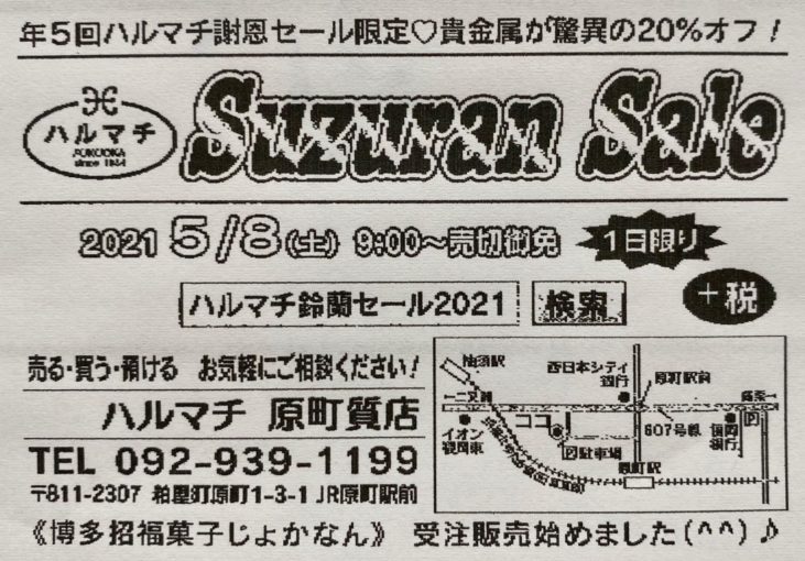 明日はいよいよハルマチ鈴蘭セール2021 福岡の質屋ハルマチ原町質店 ニュース 本日のイチオシ商品! 中央ケースにご用意している宝石&貴金属がすべて20%オフ! このチャンスをどうぞお見逃しなく!(^^)