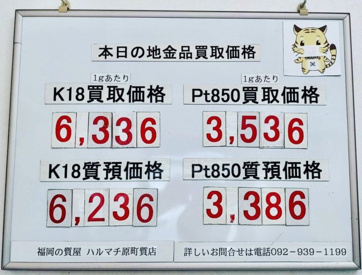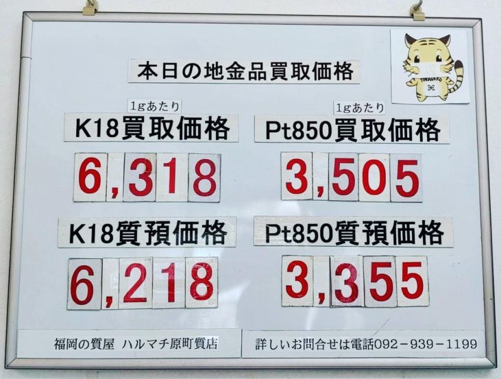 本日の18金とプラチナ850のお買い取り価格と質預かり価格です。