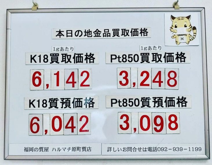 本日の18金買取価格¥6,142- プラチナ850買取価格¥3,248-