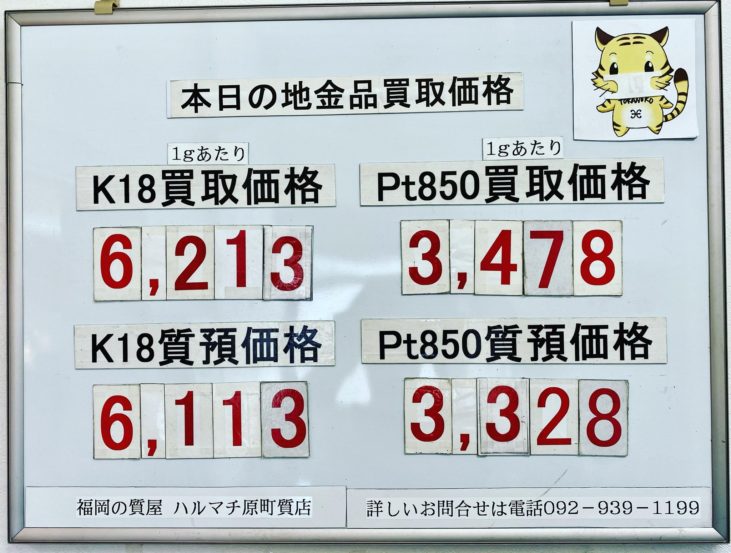 本日の18金買取価格6,213円 PT850買取価格3,478円 福岡の質屋ハルマチ原町質店