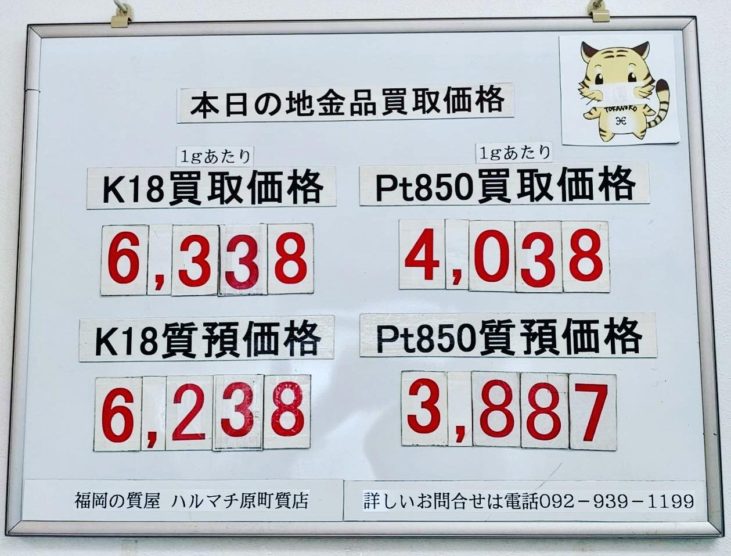 本日の18金買取価格6,338円 PT850買取価格4,038円 福岡の質屋ハルマチ原町質店