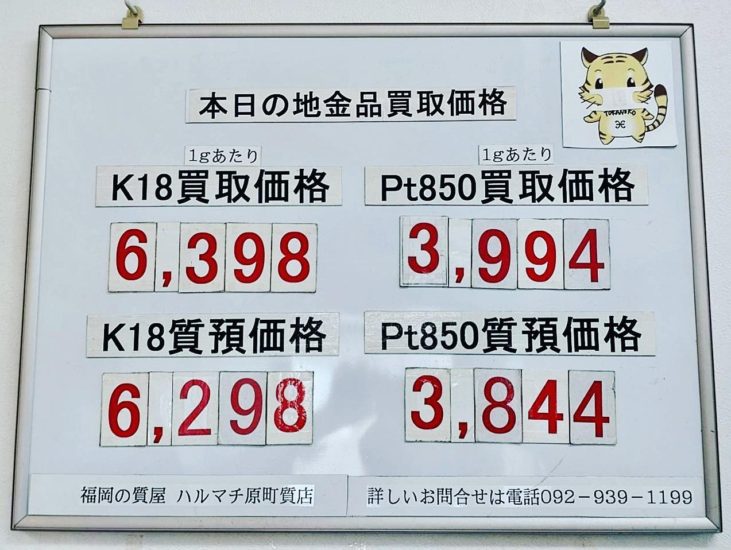 本日の18金とプラチナ850のお買い取り価格と質預かり価格です。査定も金性調べも無料です。