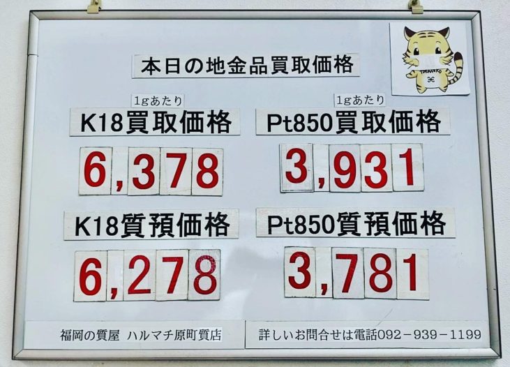 本日の18金買取価格¥6,378- プラチナ850買取価格¥3,931-