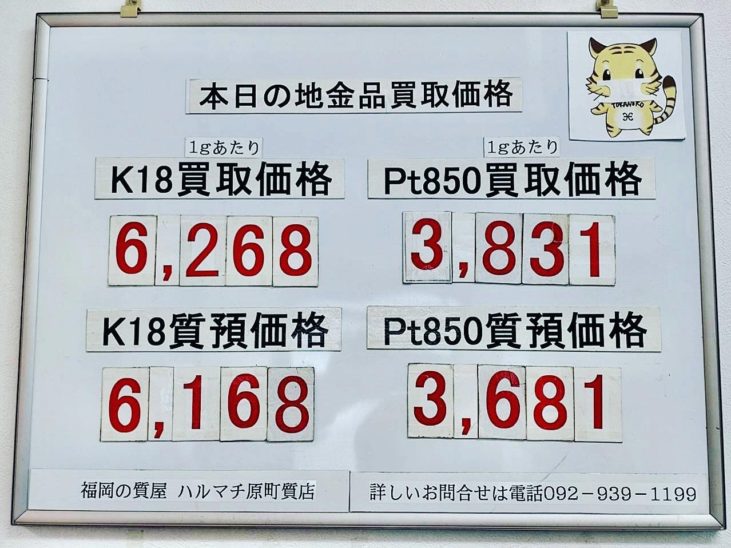 本日の18金買取価格6,268円 PT850買取価格3,831円 福岡の質屋ハルマチ原町質店