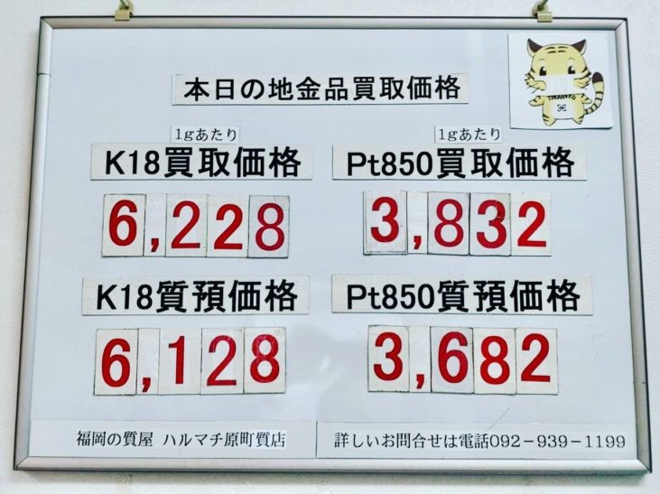 本日の18金買取価格6,228円 PT850買取価格3,832円 福岡の質屋ハルマチ原町質店