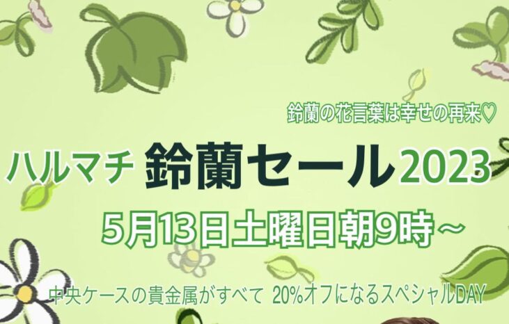 明日はいよいよハルマチ鈴蘭セール2023 福岡の質屋ハルマチ原町質店 ニュース 本日のイチオシ商品! 中央ケースにご用意している宝石&貴金属がすべて20%オフ! このチャンスをどうぞお見逃しなく!(^^)
