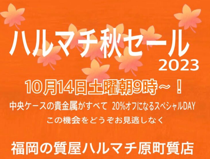 今日はいよいよハルマチ秋セール2023 福岡の質屋ハルマチ原町質店 ニュース 本日のイチオシ商品! 中央ケースにご用意している宝石&貴金属がすべて20%オフ! このチャンスをどうぞお見逃しなく!(^^)