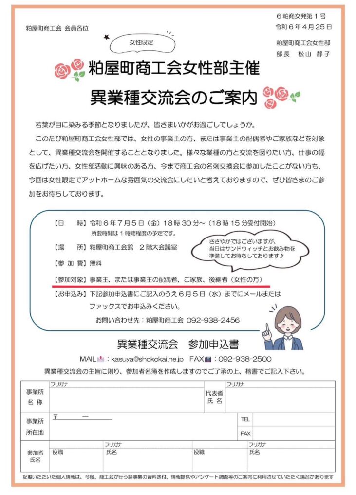 粕屋町商工会女性部主催 異業種交流会のご案内 お問い合わせは粕屋町商工会へ ニュース 【その他】 吉積佳奈のブログ 粕屋町商工会女性部主催 異業種交流会のご案内 7月5日(金)18時30分~粕屋町商工会館2階 参加対象 事業主、配偶者、ご家族、後継者 女性限定の異業種交流会です(^^)♪ お問い合わせは 粕屋町商工会 電話092-398-2500