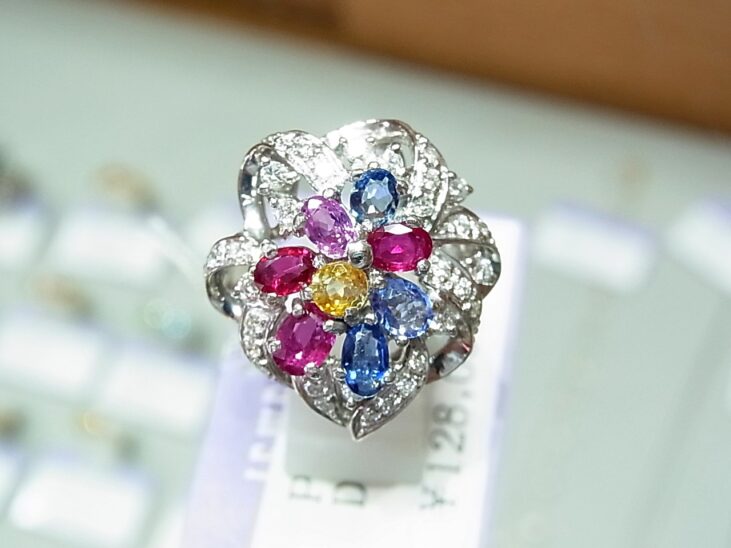 本日のおすすめはプラチナ枠の色取り取りの指輪です♪