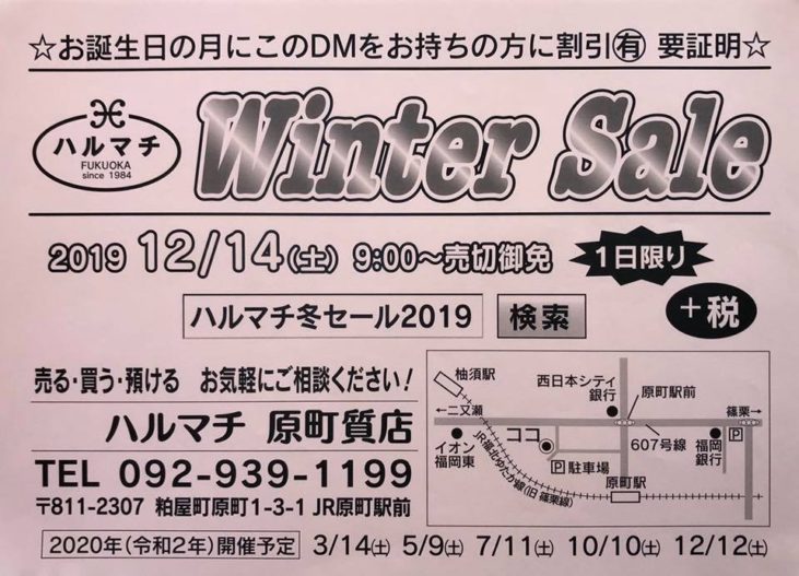 Read more.. 冬セール & お誕生日の月ワンデイサービスのご案内 福岡の質屋ハルマチ原町質店 冬セール & お誕生日の月ワンデイサービスのご案内です (^^) 詳しくは原町駅前にある福岡の質屋ハルマチ原町質店の店頭で。