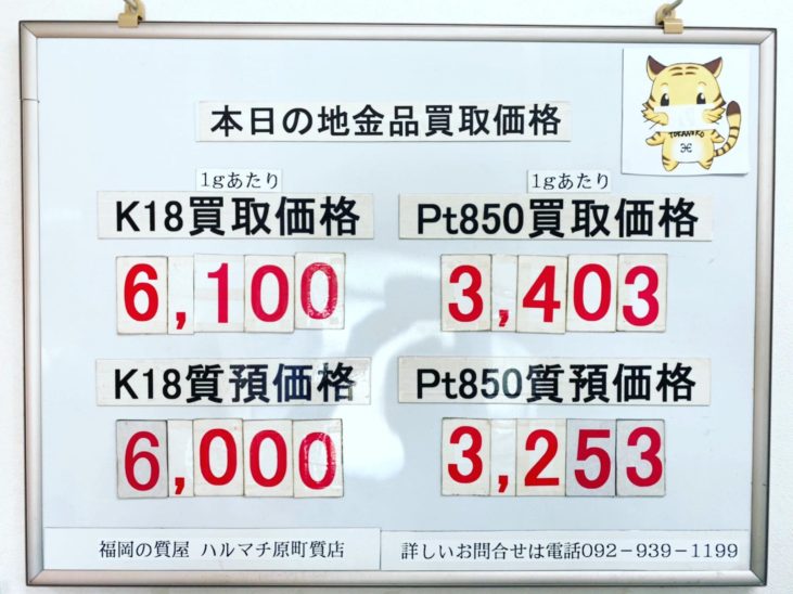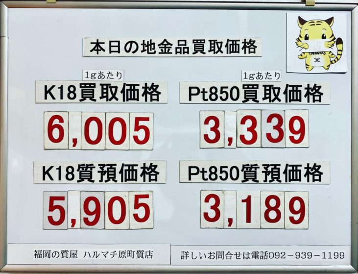 本日の18金買取価格¥6,005- プラチナ850買取価格¥3,339-